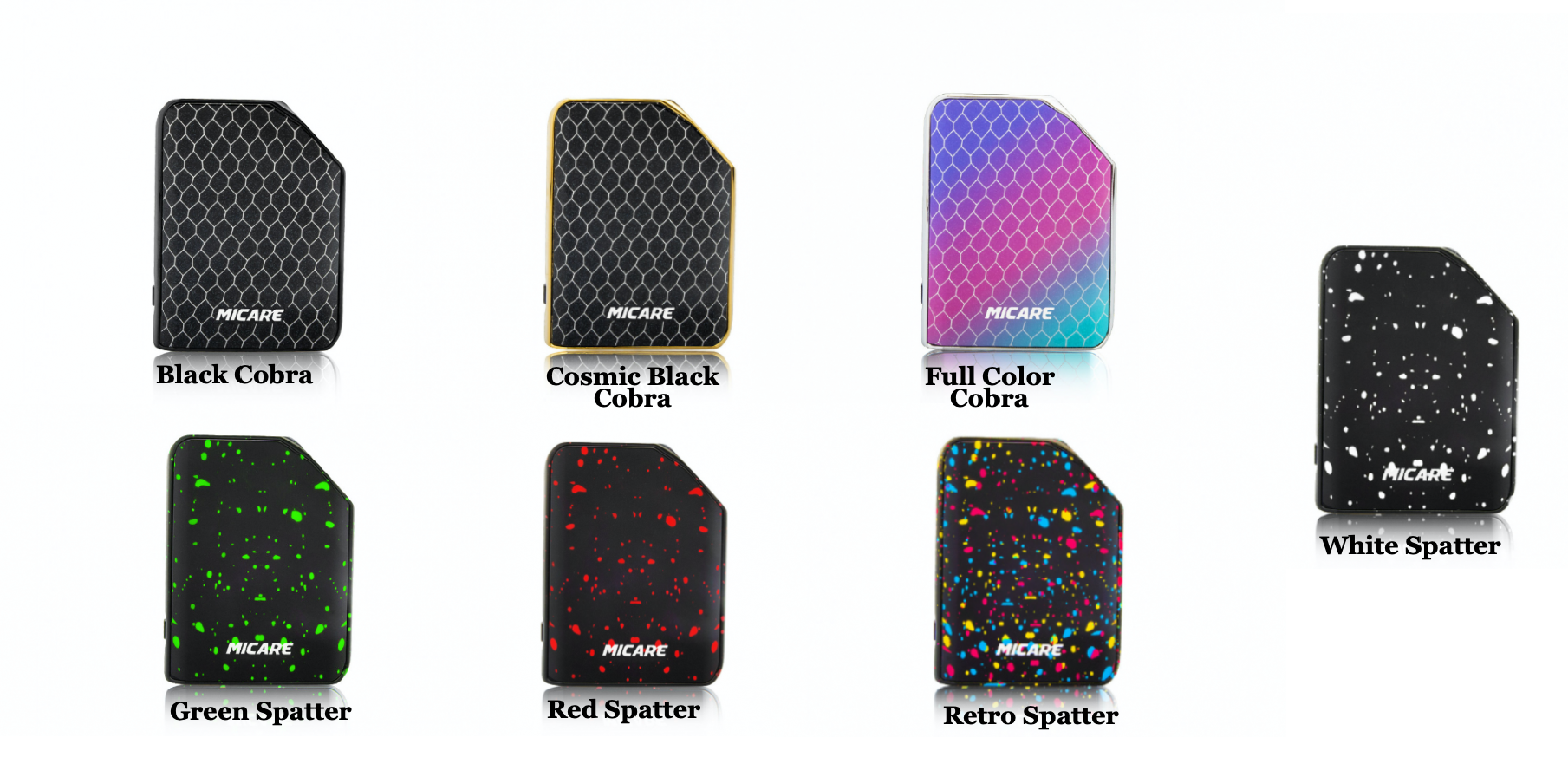 The Exxus Micare also in a stunner in the looks department. Coming in six exclusive colors; Rainbow Cobra, Black Cobra, Black White Splatter, Black Green Splatter, Black Red Spatter and Black Rainbow Spatter, be a standout from the crowd with a fashionable, modern device.