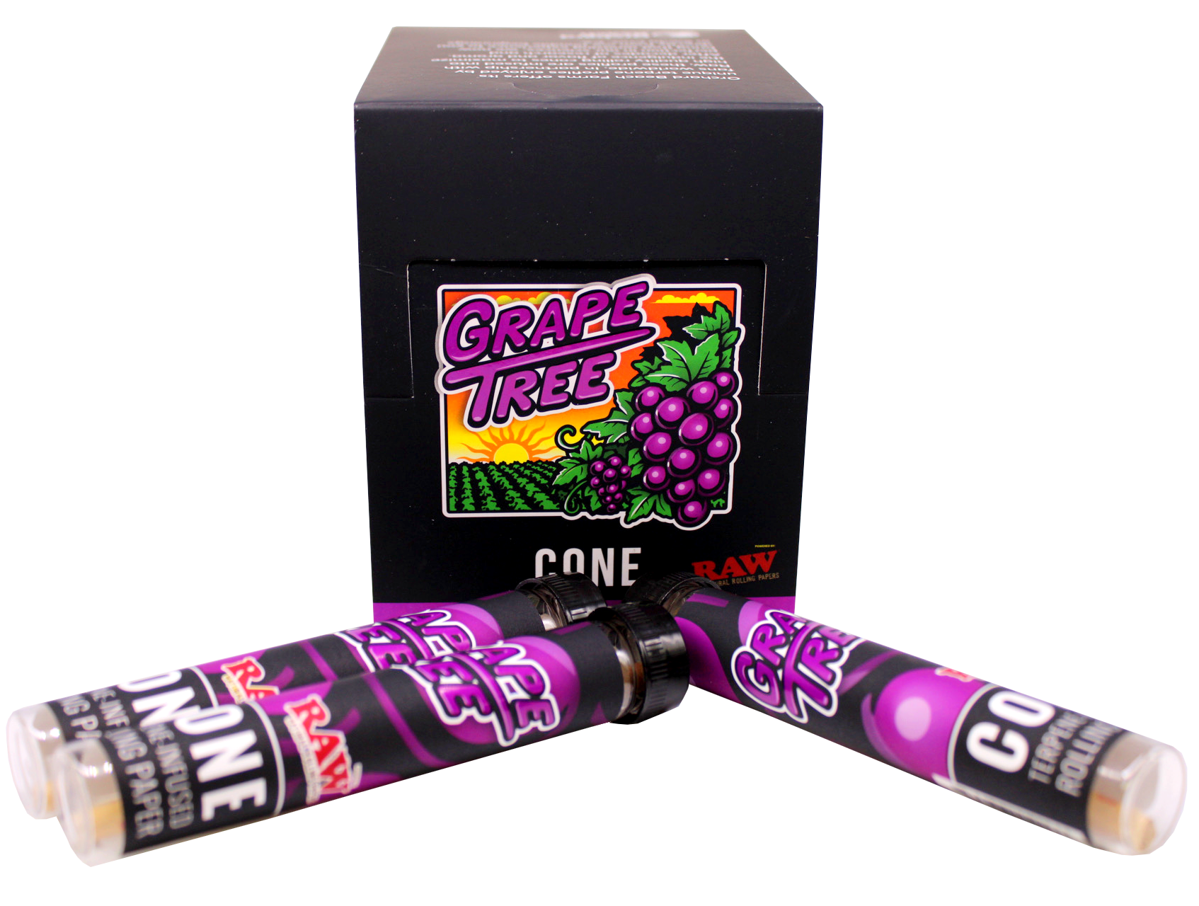 RAW and Grape Tree have teamed up and created the RAW Grape Tree Terpene Infused King Size Pre Rolled Paper Cones. Enhance your next smoke session with the highest quality terpene infused paper cone in the world. Each cones comes in a resealable tube with 12 tubes per display case.